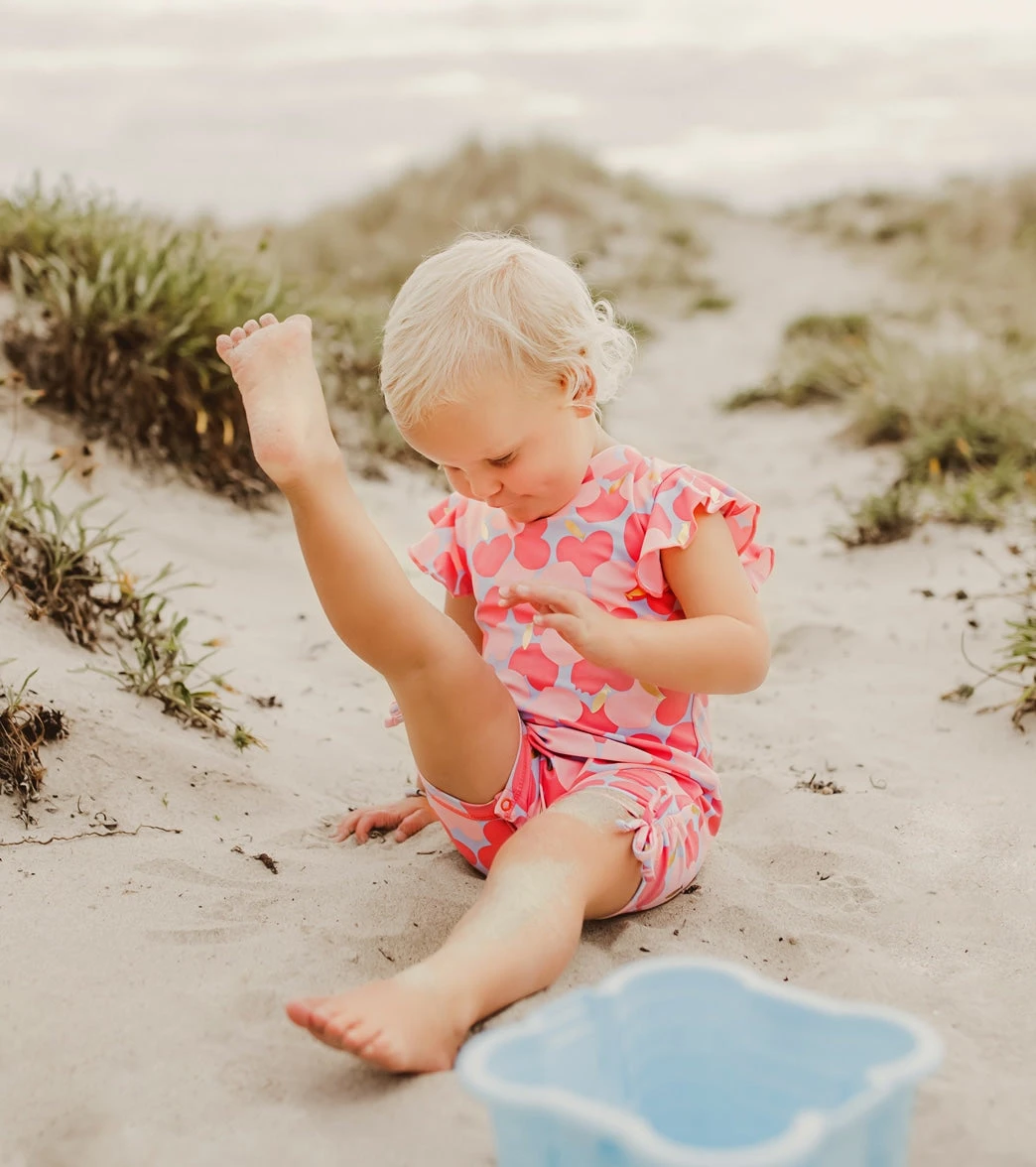 An Apple a Day! The little one will be ready to splash in The Apple Love Flutter Sleeve Sunsuit. Made using UPF 50+ Sun Protection fabric, in a cute pink toned print with gold foil accents.
