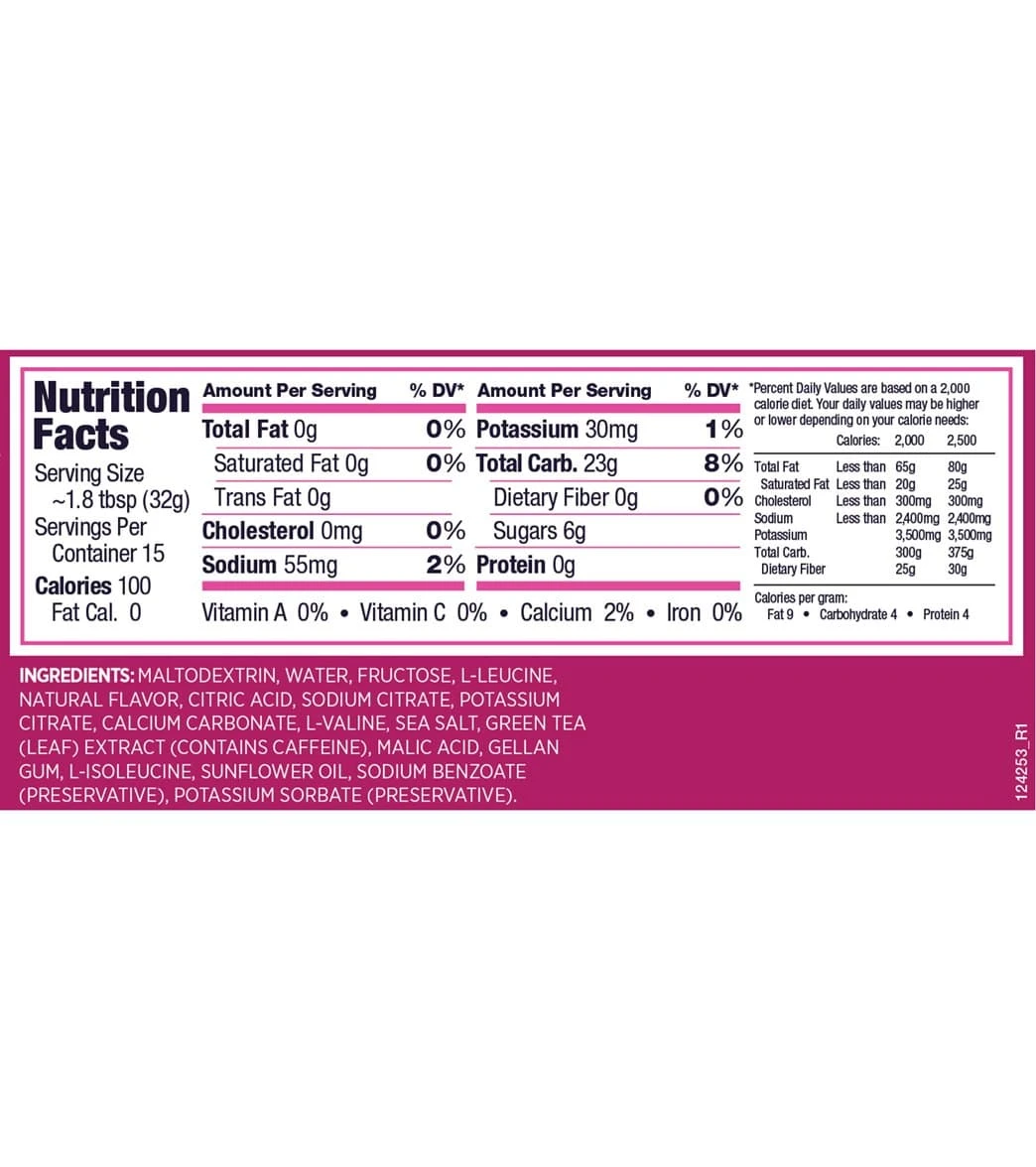 - Tri-Berry: Maltodextrin, Water, Fructose, Leucine, Natural Flavor, Citric Acid, Sodium Citrate, Potassium Citrate, Calcium Carbonate, L-Valine, Sea Salt, Green Tea (Leaf) Extract (Contains Caffeine), Malic Acid, Gellan Gum, L-Isoleucine, Sunflower Oil, Sodium Benzoate (Preservative), Potassium Sorbate (Preservative).