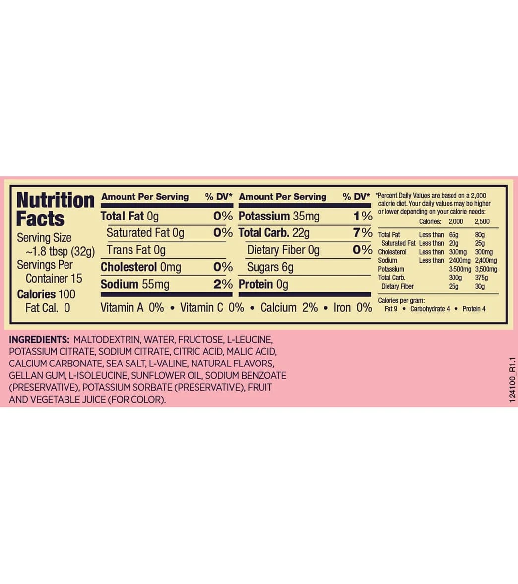 - Strawberry Banana: Maltodextrin, Water, Fructose, Leucine, Potassium Citrate, Sodium Citrate, Citric Acid, Malic Acid, Calcium Carbonate, Sea Salt, Valine, Natural Flavors, Gellan Gum, Isoleucine, Sunflower Oil, Sodium Benzoate (Preservative), Potassium Sorbate (Preservative), Fruit and Vegetable Juice (for Color).